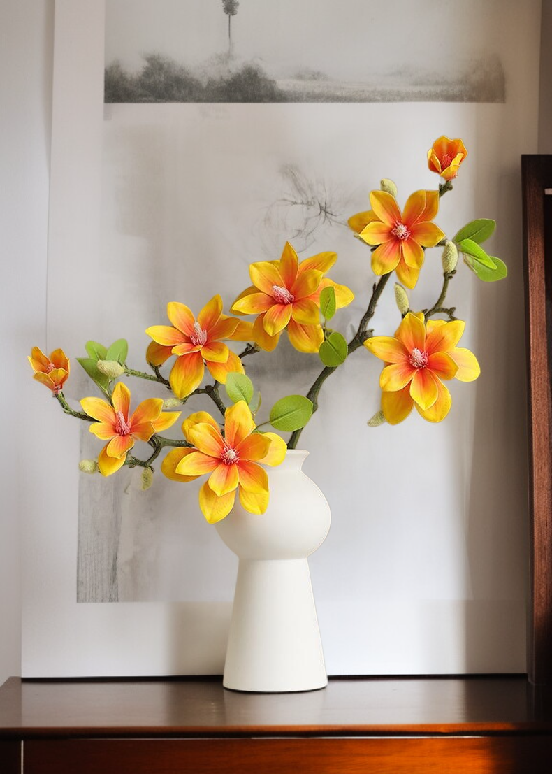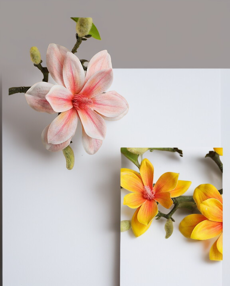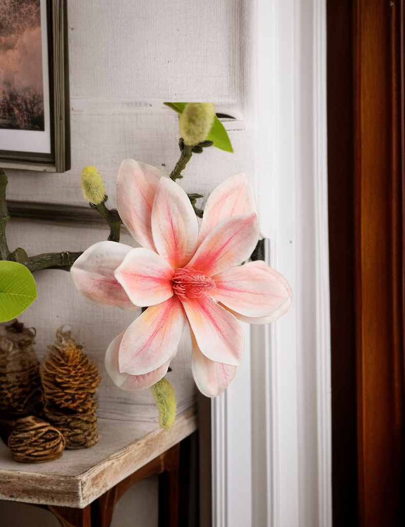 Realistická simulace květu magnólie, vhodná pro dekorace interiéru. Odolné materiály, snadná údržba, dlouhá životnost. Moderní design pro každou domácnost.